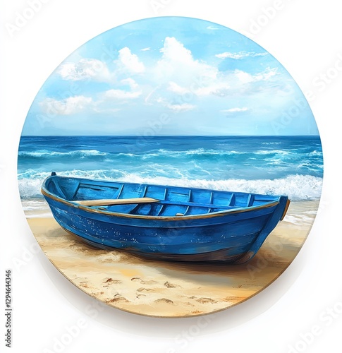© Anastasiia, Naklejka premium Old blue boat resting on sandy beach near calm ocean under a clear sky