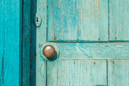 © RomanovRV, Fototapeta premium Old blue wooden door with brass handle Round