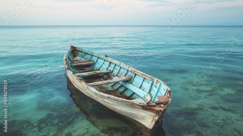 © PoyTumStudio, Fototapeta premium Old boat floating in clear turquoise water