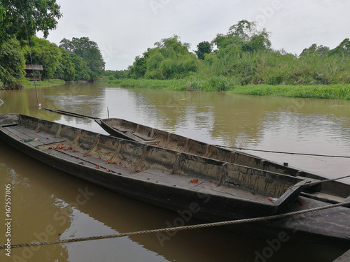 © Thiradech, Fototapeta premium Old boat in the river thai