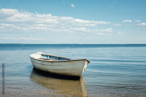 © Art IF, Naklejka premium Old boat on calm lake, serene scene
