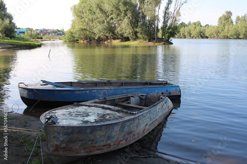 © Алла Мосурова, Fototapeta premium old boats on the river Bank in the summer in a Siberian village