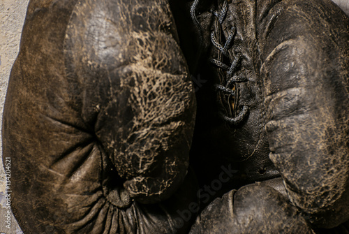Naklejka premium old boxing gloves hang on nail on texture wall