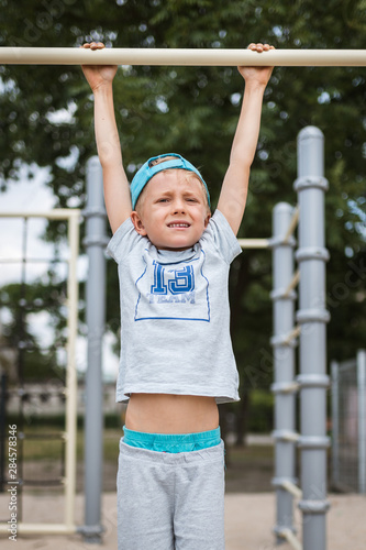 Fototapeta premium 6-7 old boy hangs on the exercise bar in the playground
