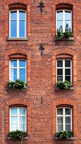 © aini, Fototapeta premium Old brick building with windows and flowers