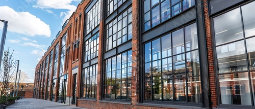 Obraz premium Old brick buildings with tall windows and red accents, adding character to...