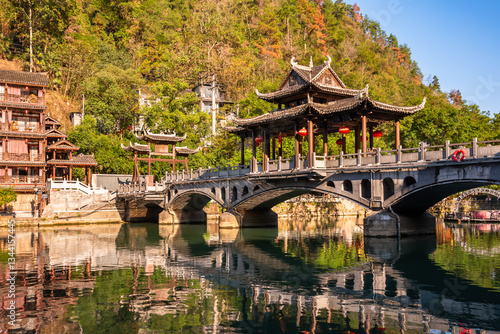 © Maresol, Fototapeta premium Old bridge in Fenghuang ancient town, China. Traditional chinese wooden houses in old watertown