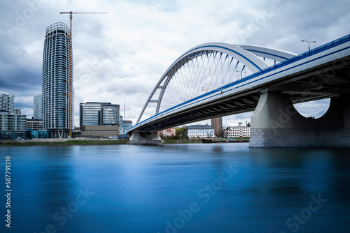 © Naya Na, Naklejka premium Old Bridge, or Starý most over the Danube, dedicated pedestrian and cycle paths with views of Old Town skyline in Bratislava, Slovakia