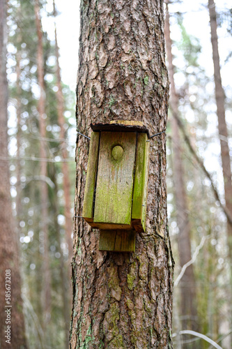 Fototapeta premium old broken nesting box hanging alone on tree trunk