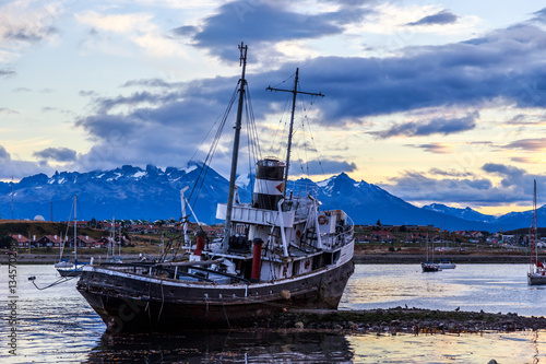 © vadim.nefedov, Fototapeta premium Old broken ship stranded ashore and village with mountains