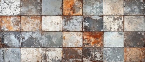 © Adi, Fototapeta premium Old brown gray rusty vintage worn shabby patchwork motif tiles stone concrete cement wall texture background