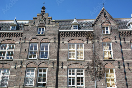 Fototapeta premium Old brown historical buildings in Amsterdam in the day under the blue sky