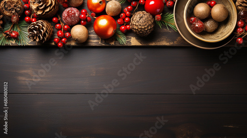 Naklejka premium Old brown wooden table with christmas decoration from above, Generative AI