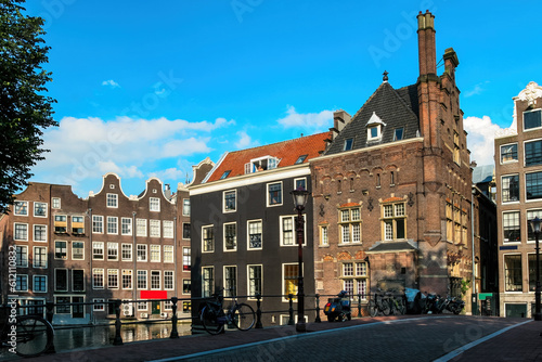 Fototapeta premium Old building and bridge over canal in Amsterdam, Netherlands.