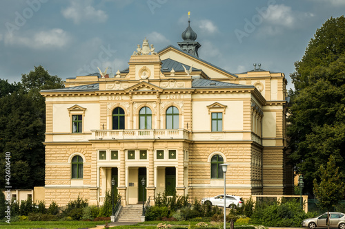 © Robert, Fototapeta premium old building surrounded by trees standing on a street in the city center