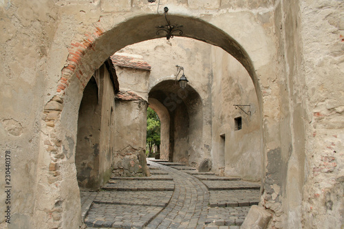 Naklejka premium Old buildings in Sighisoara, Romania. Details of Romanian architecture, walls and gates. Classic stone street.
