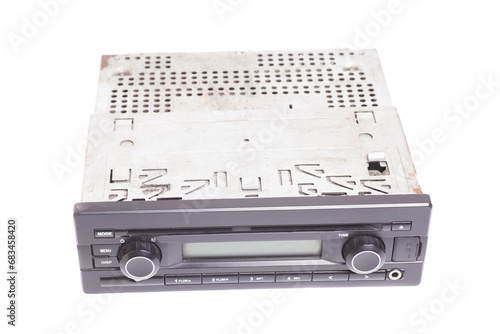 © yurchello108, Obraz premium Old car radio isolated on white background.