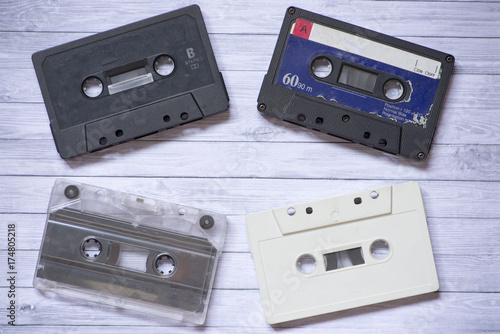 Fototapeta premium Old cassette tapes with a wooden background