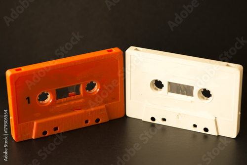 © vicenfoto, Obraz premium Old cassettes on a background of a black color