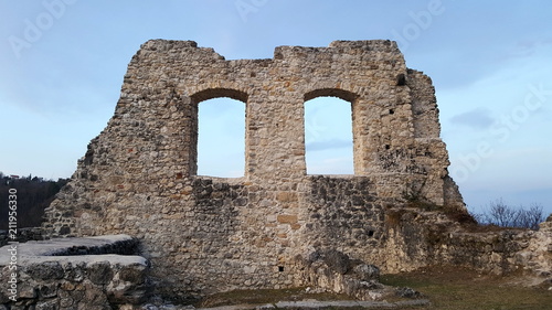Naklejka premium Old castle ruins stone wall with two windows openings left intact and located in Samobor, Croatia