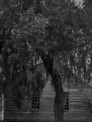 © Robert, Naklejka premium Old church in black and white through the trees. Halloween type of background.