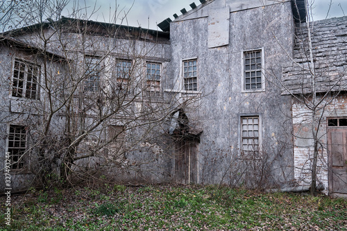 © Андрей Журавлев, Obraz premium Old city closed by tree branches on a background of gray cloudy sky