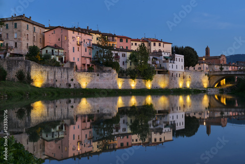 Obraz premium Old city reflection in Tevere river, Umbertide, Italy