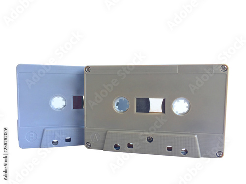 Obraz premium Old classic audio gray and brown tape cassette overlapping isolated on white...
