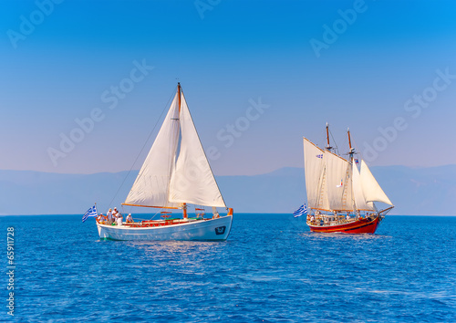 Fototapeta premium 2 Old classic wooden sailing boats in Spetses island in Greece