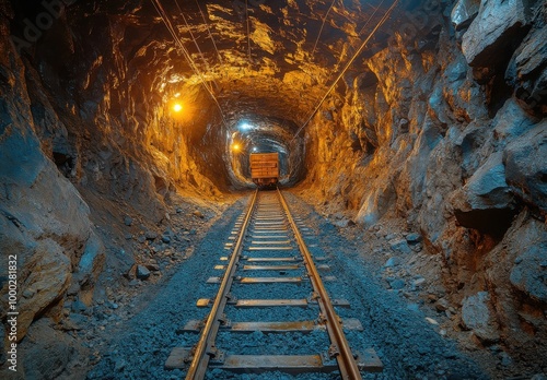 © Professional Agency, Naklejka premium Old coal mining site with excavated tunnel and coal cars on tracks
