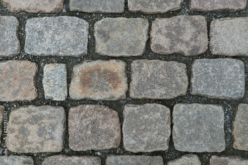 Fototapeta premium Old cobbled stone texture background, pavement structure on road.