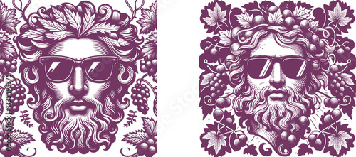 Fototapeta premium old color Engraving Design: Mythological Man's Face with Sunglasses, Grapes,...