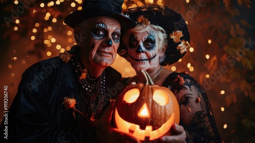 Fototapeta premium Old couple holding jack o lantern in Halloween lightning lights background