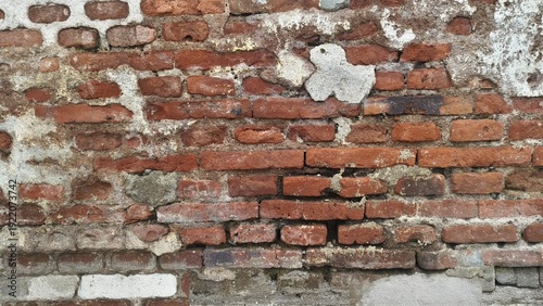 Obraz premium Old damaged red brick wall with cracked plaster and rough texture, showing...