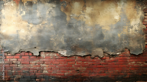 © Siasart Stock, Obraz premium Old Damaged Wall Reveals Red Bricks Underneath Crumbling Plaster Texture