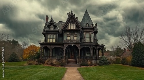 © isrofiyah, Fototapeta premium Old, Dark Victorian House with a Long Walkway and a Cloudy Sky
