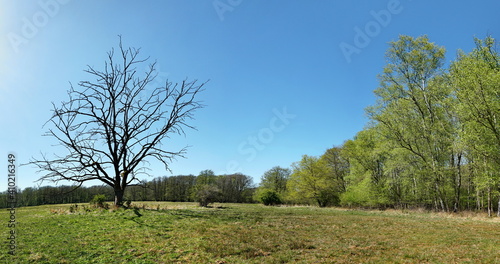 © ExQuisine, Fototapeta premium Old dead Tree in Spring Panorama in a Bog - Panorama