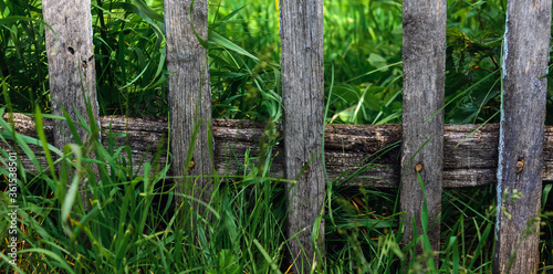 Fototapeta premium Old dilapidated wooden fence with rusty nails against of lush green grass. Concept of simple rural life. Village background.