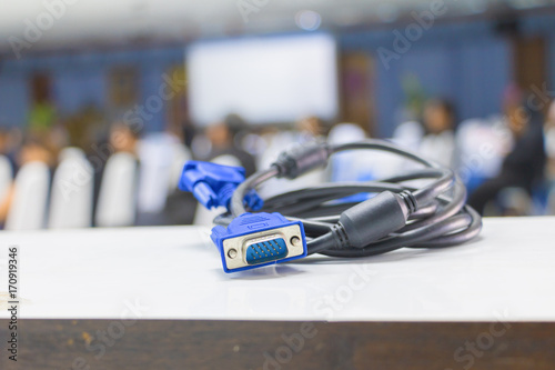 Obraz premium old dirty VGA tech cable connector of computer on table white Blur meeting room background