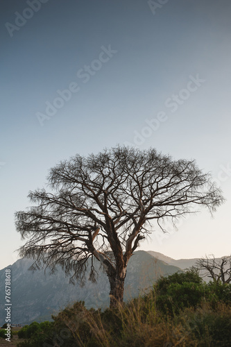 Fototapeta premium Old dry dead try with branches against mountains and sky