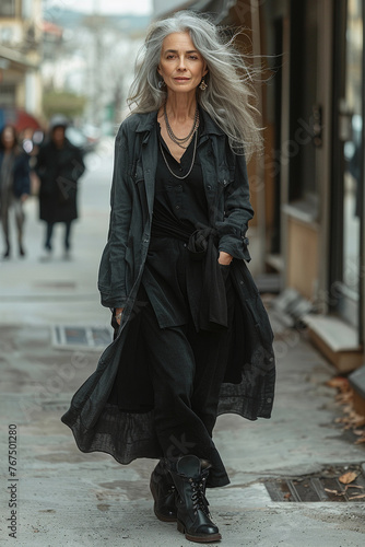 Fototapeta premium Old elderly beautiful woman with gray hair dressed trendy clothes fancy boots...