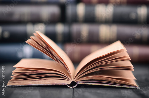 © Corgarashu, Obraz premium Old empty notebook on the black wooden background.