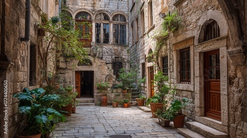 Fototapeta premium old european courtyard, stone walls and windows, rustic urban background