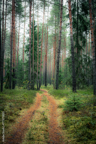Fototapeta premium Old European forest with a scenic path leading through a lush pine trees in Latvia. Deep green colors and dreamy landscape.