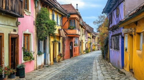 © Ilmi, Fototapeta premium Old European street with colorful buildings and cobblestone roads