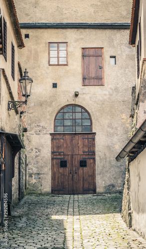© ArtisansofPhotograph, Fototapeta premium Old european wooden door down the alleyway