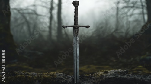 © Aracazen, Naklejka premium Old fantasy sword stuck on the forest