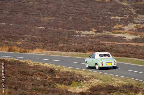 © Matthew, Fototapeta premium Old fashioned green classic car driving alone along narrow country road in Derbyshire peak district countryside moorland on sunny day. Picturesque summer scene tarmac lane winding through fields.