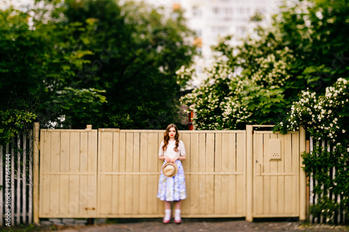 © benevolente, Naklejka premium Old fashioned russian stylish girl. Cutie young in vintage retro long skirt, white top and curly red hair and straw hat posing for camera with fence and green trees on background. Pin up summer style