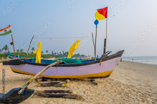 Fototapeta premium old fishing boats in sand on ocean in India on blue sky background